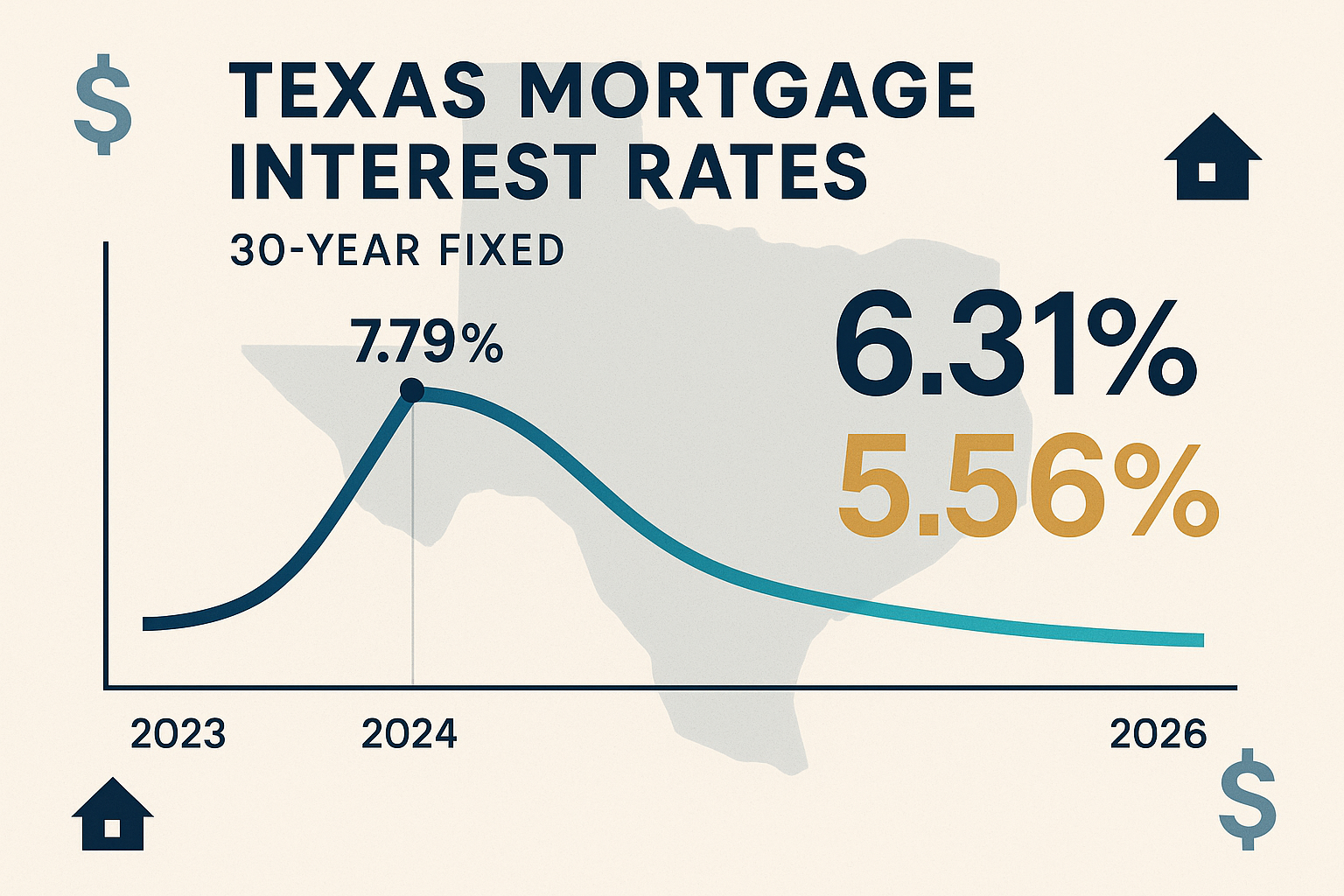 This image presents a graphical forecast of Texas 30-year fixed mortgage interest rates from 2023 through 2026. The line graph shows an initial rise to a peak interest rate of 7.79% around early 2024, followed by a gradual decline. Projected interest rates decrease to approximately 6.31% and further to 5.56% by 2026. The background includes a subtle outline of the state of Texas, symbolizing the geographical focus of the data. The graph is useful for understanding mortgage rate trends impacting homebuyers, lenders, and real estate professionals in Texas over the specified period.