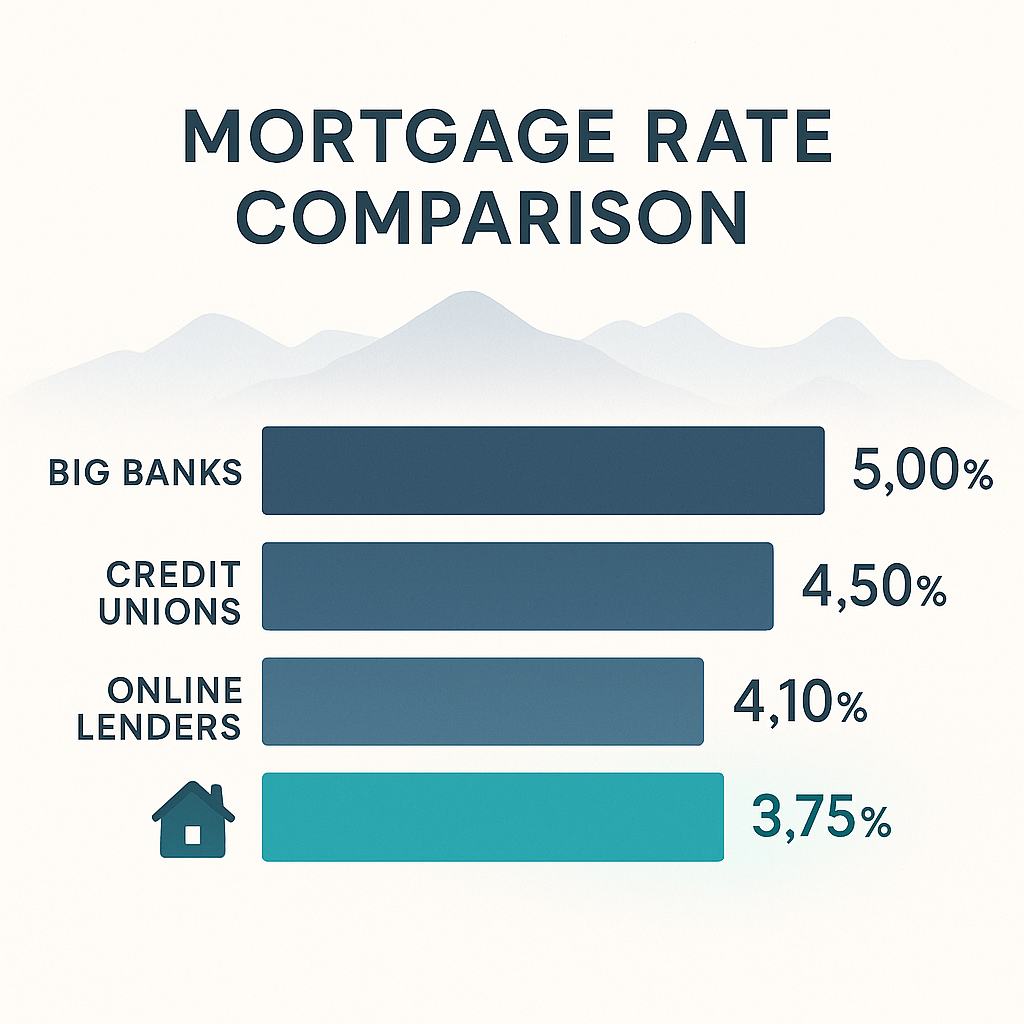 This bar chart visually compares the mortgage interest rates offered by different types of lenders. It shows that big banks have the highest rate at 5.00%, followed by credit unions at 4.50%, online lenders at 4.10%, and another lender category represented by a house icon offering the lowest rate at 3.75%. The chart provides a clear comparison useful for prospective home buyers evaluating mortgage options.